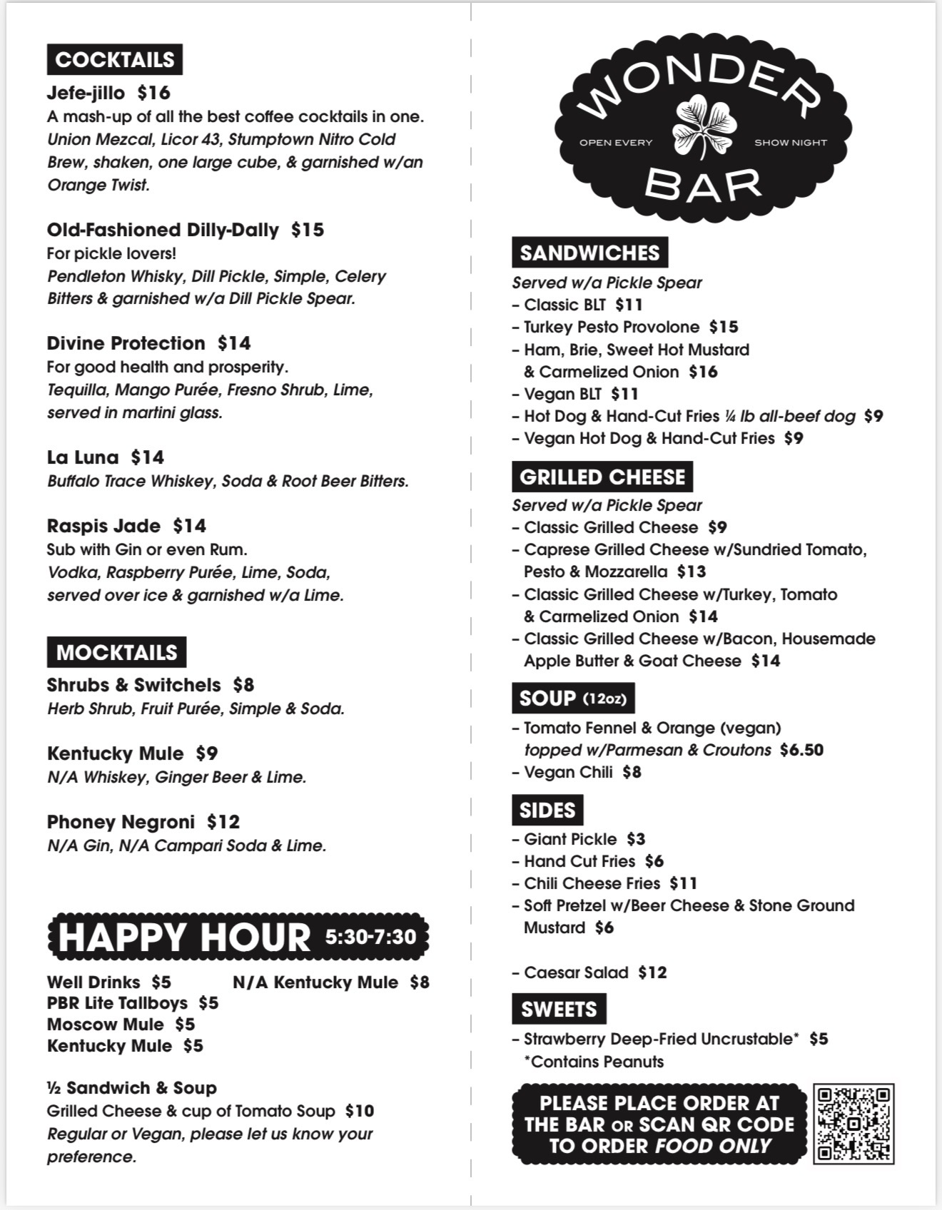 Full menu available open to close, including Sandwiches, Soups, and Sides